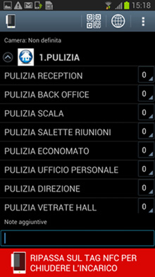 Une fois que l’opérateur entre dans la zone où doit être effectué le service d’externalisation hôtelière, de nettoyage, de maintenance, etc., un menu apparaît qui permet de choisir l’opération à effectuer en plus de celles déjà assignées.